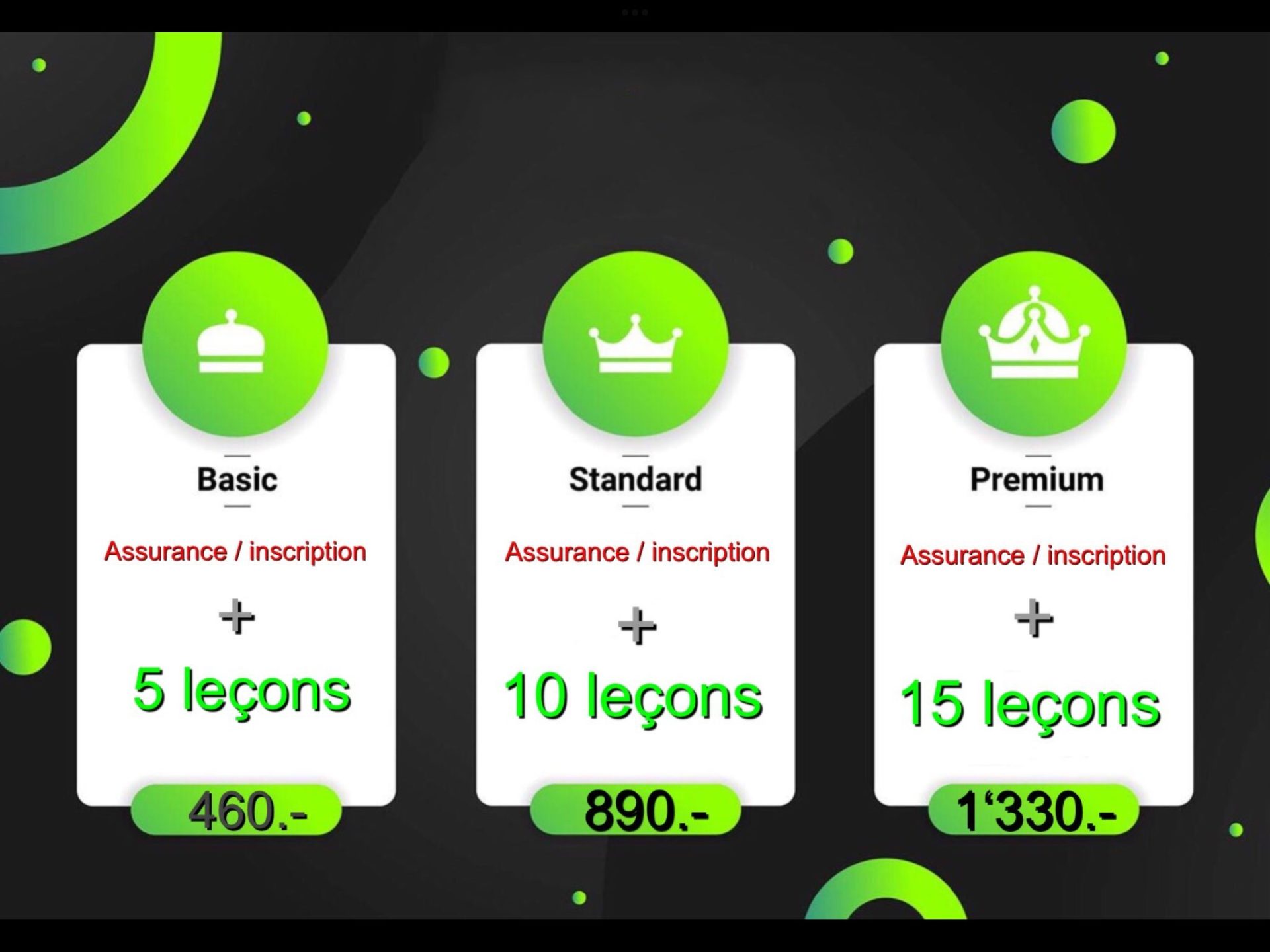 Leçon individuelle 95.—/ 60 minutes ou 140.—/90 minutes
